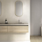 Una melamina pensada para mobiliario, con reflejos multicolor, nudos negros pequeños y sutiles y un efecto completamente natural